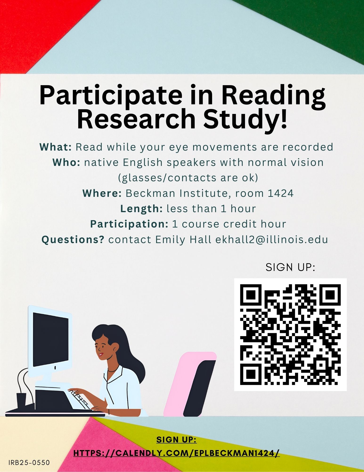 Description: During this study you will read several sentences and answer comprehension questions on a computer. Your eye movements will be recorded with an eye-tracker. We seek to understand more about sentence processing.